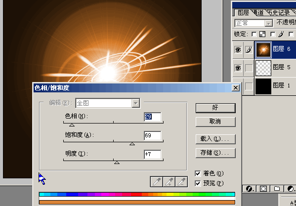 对图层 6做色相/饱和度(图像 / 调整 / 色相/饱和度),参数如下 (注意着色要选中)