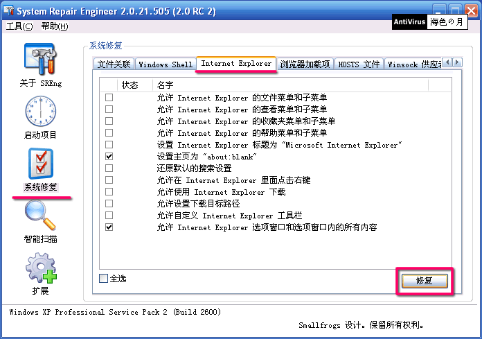 这里列出了常见的一些和IE相关的限制项目,勾选需要修复的项目,点击“修复”按钮进行修复。