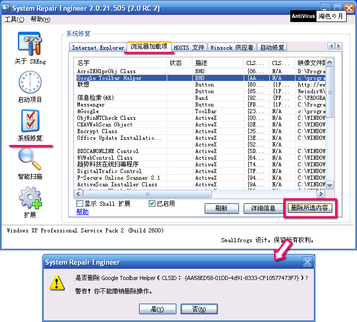 图中举例:恢复IE主页为“空白页” 和 修复Internet选项对话框内容设置的禁用。