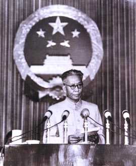 1949年9月,在中国人民政治协商会议第一届全体会议上当选为中华人民共和国中央人民政府副主席,随后被任命为中央人民政府人民革命军事委员会副主席。他在制定国家政治、经济、文化、教育、外交等方面的方针政策中发挥了重要作用。1950年他主持制定的《中华人民共和国土地改革法》等文件,成为建国初期指导全国各地土地改革健康发展的基本依据。1954年9月在第一届全国人民代表大会一次会议上作《关于中华人民共和国宪法草案的报告》,并当选为第一届全国人民代表大会常务委员会委员长。1956年9月在中共第八次全国代表大会上,他代表中共中央作政治报告,提出把中国尽快从落后的农业国变为先进的工业国,为社会主义事业的发展和党的建设规定了方向。在中共八届一中全会上当选为中央政治局常务委员、中央副主席。1959年4月,在第二届全国人大一次会议上当选为中华人民共和国主席、国防委员会主席。60年代初期,中国的经济发生了严重的困难,他深入实际,进行了大量的调查研究,明确提出要按经济办法管理经济,并与周恩来、陈云、邓**一起制定了一系列注重实效的政策措施,支持和指导实施“调整、巩固、充实、提高”的正确方针,使国民经济得到恢复和发展。在社会主义建设时期,他长期主持中央一线的工作,同中共中央其他领导人一起,为寻找一条适合中国国情的建设道路进行了深入的探索,提出了许多独具特色的思想理论。他对人民代表大会制度的建立和施行进行了开拓性的工作。他在党的建设方面有突出的重要建树,所著的《论共**员的修养》,《论党》等,丰富了马克思列宁主义、毛**思想关于党的建设的理论。1960年、1963年和1964年他先后出访苏联、印度尼西亚、缅甸、柬埔寨、越南、朝鲜、巴基斯坦、阿富汗、东巴基斯坦(今孟加拉国)等国,发展了同这些国家的友好关系。1965年1月在第三届全国人民代表大会一次会议上再次当选为中华人民共和国主席、国防委员会主席。1966年“文化大革命”开始后,他受到错误的批判,遭到林彪、江青集团的政治陷害和人身摧残,被撤销一切职务。在最艰难的时刻,他仍然对党和人民、对共产主义的远大理想充满信心,坚信“好在历史是人民写的”。1969年11月12日在河南开封病逝。1980年2月中共十一届五中全会为恢复刘少奇的名誉作出专门的决定。主要著作收入《刘少奇选集》(上下两卷)。
