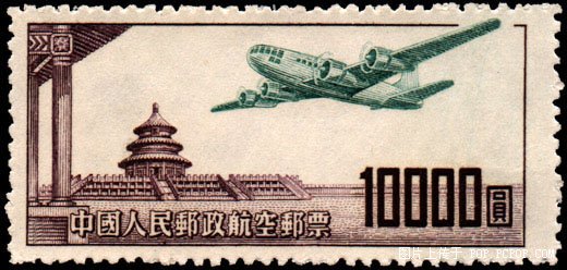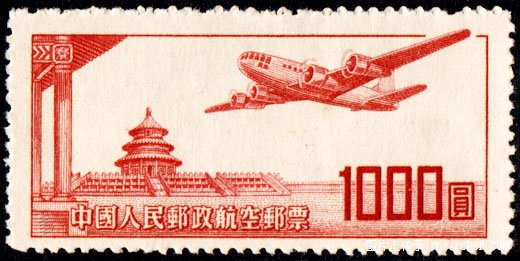 新中国成立后,于1951年5月1日发行了第一套中国人民邮政航空邮票。图案是一架飞机从北京天坛上空飞过,票面上印有“航空邮票”字样。要注意,虽然有的纪念邮票或特种邮票上印有飞机图案,但不是航空邮票。如我国发行的“首都国际机场”邮票和“邮政运输”邮票第4枚都是特种邮票而不属航空邮票。