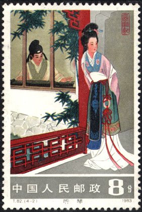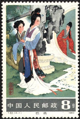 1983年2月21日,为了反映中华民族灿烂的古典文学风貌,中华人民共和国邮电部发行一套《西厢记》特种邮票,全套4枚。这套邮票的4枚图案,根据《西厢记》的几个主要故事情节,约请中国著名女画家王叔晖创作了“惊艳”、“听琴”、“佳期”、“长亭”四幅工笔重彩人物画。T·82·(4-1)图案描绘了书生张君瑞上京应考,顺路游览普救寺时,与相国千金小姐崔莺莺邂逅相遇的场面。T·82·(4-2)图案描绘了张君瑞在西厢房弹琴寄情于崔莺莺的情景。T·82·(4-3)图案描绘了莺莺在侍女红娘的帮助下,偷偷到西厢房和张君瑞相会订终身的场面。T·82·(4-4)图案描绘了崔莺莺送张君瑞上京应考,在十里长亭黯然伤别的场面。
