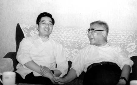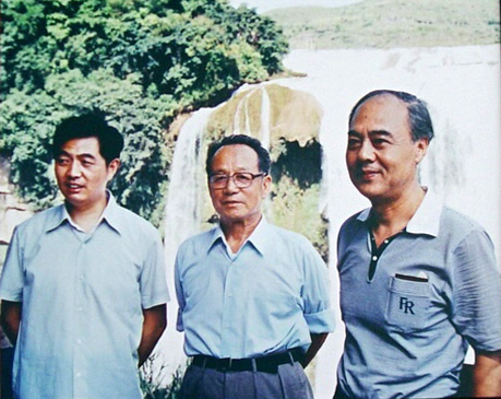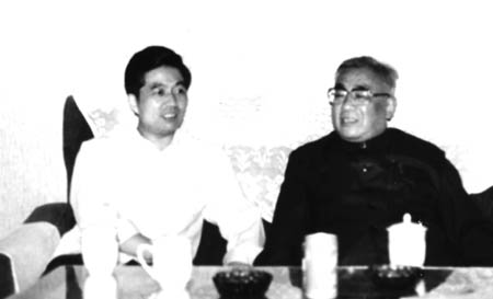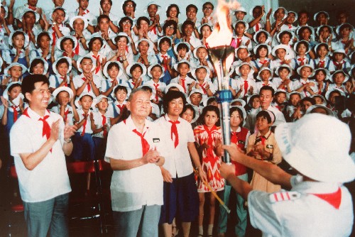 1983年8月4日,陈云和胡锦涛同志在北京出席少先队夏令营活动的火炬点燃仪式。
