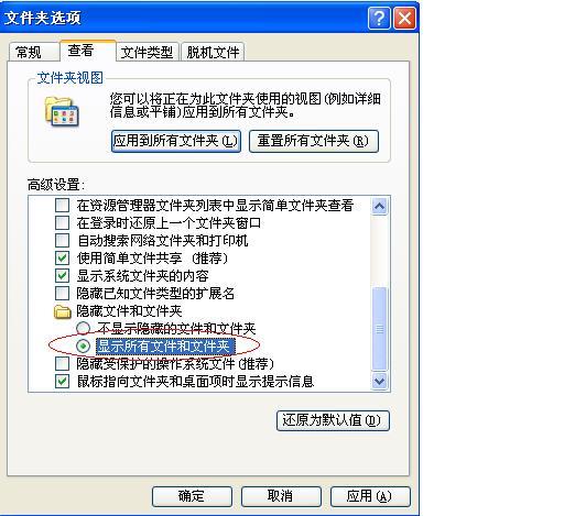 显示所有文件和文件夹。和把隐藏操作系统保护的文件的勾去掉。找到他