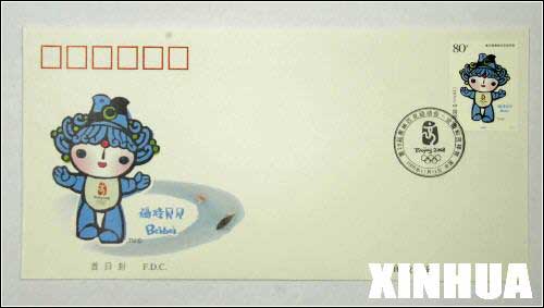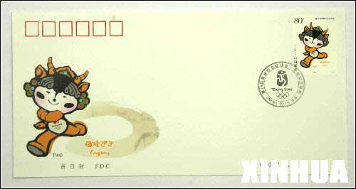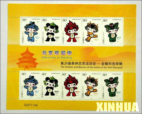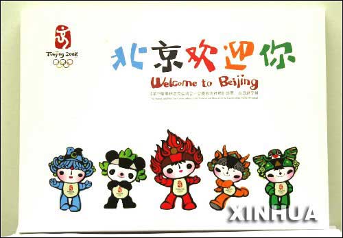 中国集邮总公司将于2005年11月12日发行“北京欢迎你”――《第29届奥林匹克运动会―会徽和吉祥物》系列纪念邮品。图为邮品专辑封面