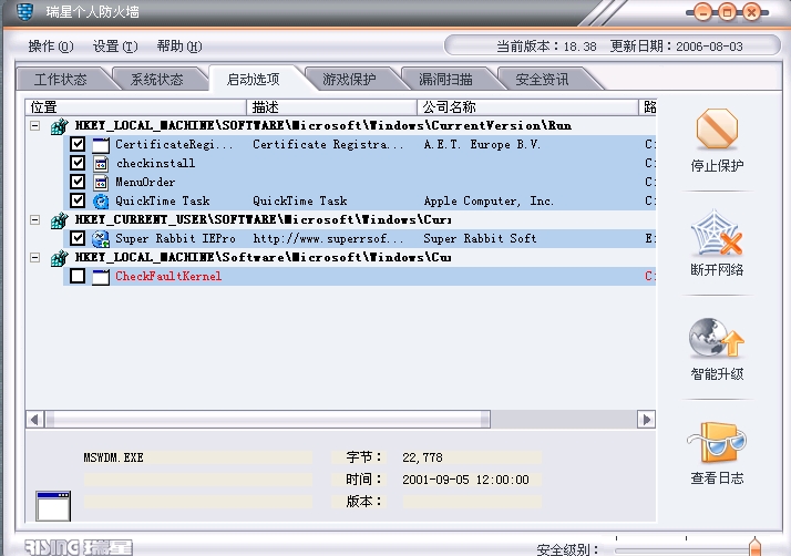 老大好,那个mswdm.exe 被我删掉了。重启后看System Repair Engineer里也没有mswdm.exe了。只是看瑞星的启动项里还有。