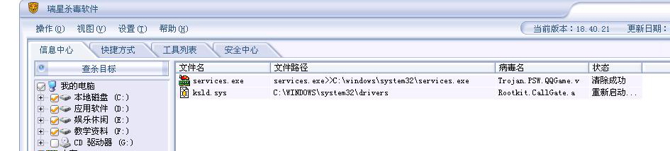 我中了Trojan.PSW.QQGame.v和Rootkit.callGate.a