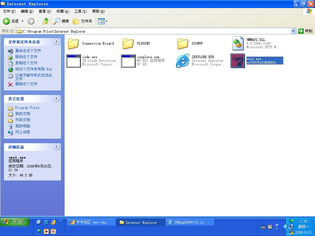 不过,我在C:\Program Files\Internet Explorer发现一个不明文件,sys1.exe,目前没敢动它,不知什么东西,在帮忙看一下,新日志已经传好了!!!