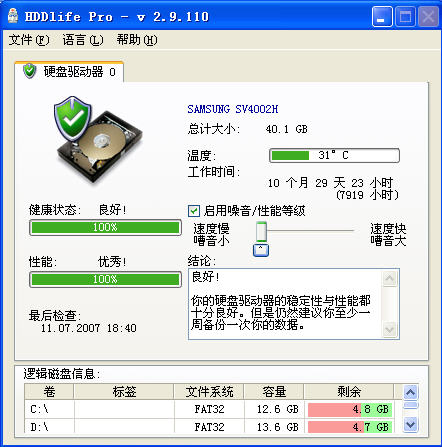 一款不错检测硬盘的运行时间,温度,健康态和性能好软件与大家分享一下