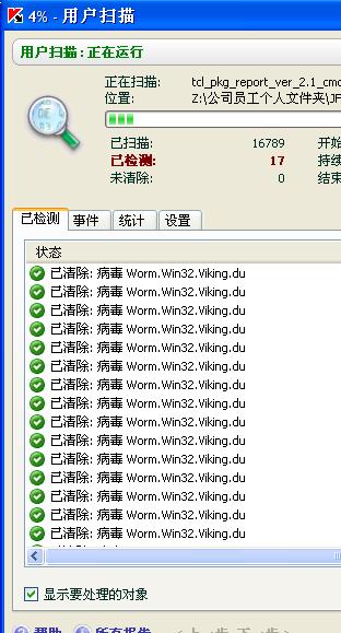 天杀的vking又来了!这次瑞星又没有检测到!额的神啊!我怎么想起来买瑞星的啊!网络不正常,下个卡巴斯基杀个文件夹看看!结果:
