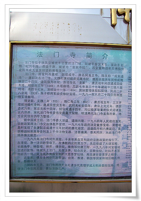 法门寺位于扶风县城北10公里处的法门镇.是我国境内安置释迦牟尼真身舍利的著名寺院.法门寺始建于东汉桓、灵年间。1981年,寺内砖塔半壁倒塌,仅余一半巍然斜立。1987年国家拨款重修法门寺,在清理塔基时,发现地宫。发掘了佛指舍利等许多稀世珍宝。
