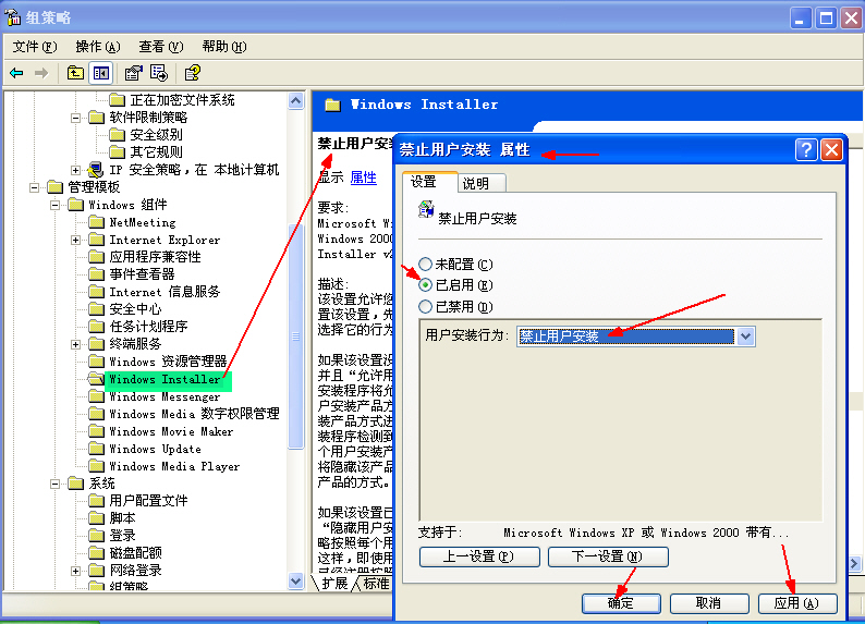 在“组策略”中设置“禁止安装程序”。