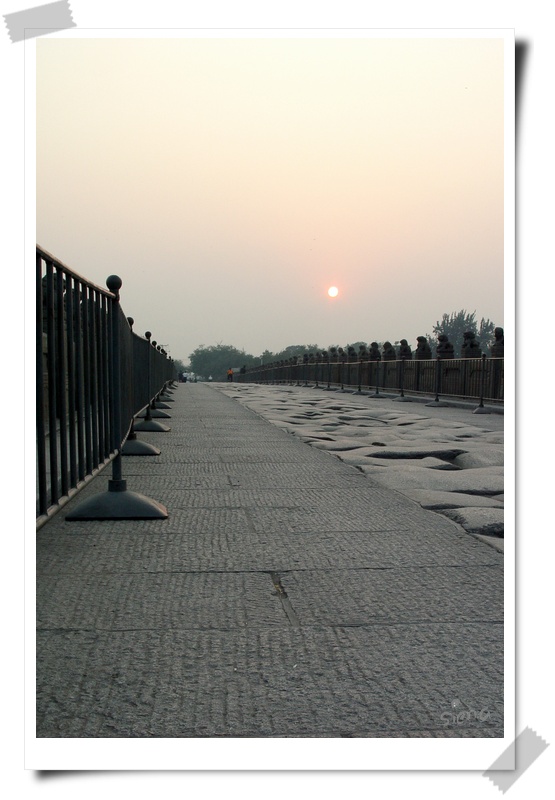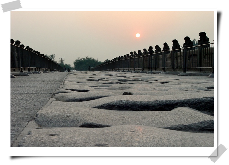 因为在宛平城城墙上偷窥沿墙人家用时过久,所以到了桥上,已近五点了,保留的旧桥石发着金光