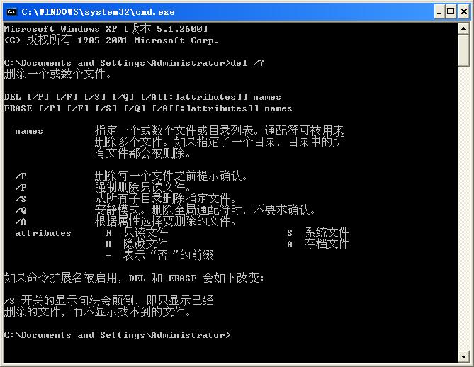 你说要知道它的用法可打入del /?回车即可得到帮助。但是我这样做了后,然后运行它就闪了下就没了