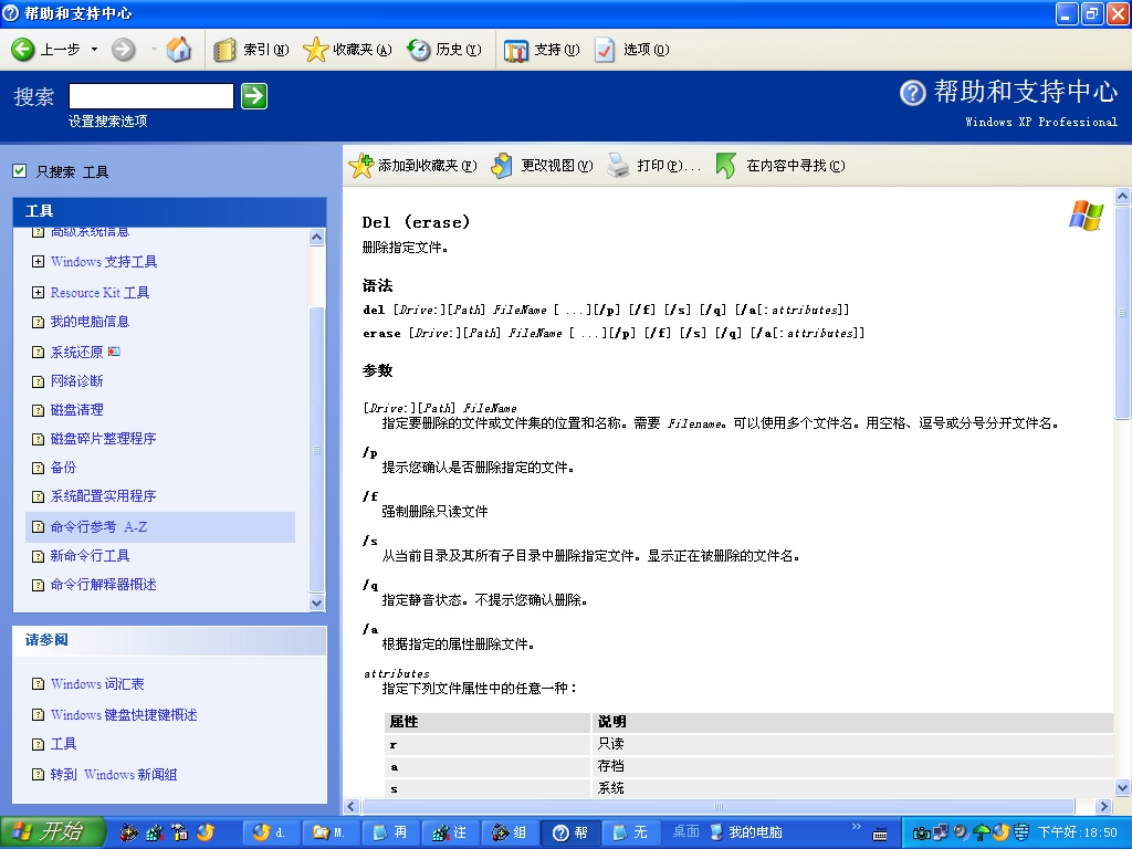 可以打开系统的帮助查到有关命令的使用方法:例如“del删除命令”参见下图
