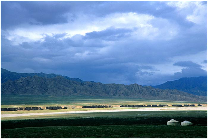 戈壁和万丈盐桥 铁路出了德令哈后,沿途完全是一片戈壁荒漠的景象,很长一段都见不到人烟,只有偶尔孤零零的几座道班工的小房子。大部方地方都生有一些生命力顽强的荆棘,被称为“骆驼草”,一丛丛互不相连,其间布满尚不太厚的黄沙,远处山脉起伏,山上隐隐现出血红的色调,景象苍茫浑荒,幸运时还可以见到一群群的野骆驼。绕过铁路左方的海拔4040米的阿木尼克山,铁路开始向南行驶,在此之前一直是向西。215国道又渐渐与铁路并行。下来就可见青藏线最壮观的景象之一—“万丈盐桥”,万丈盐桥坐落在距格尔木60公里的察尔汗盐湖上,全长32公里,桥的两面分别是东达布逊湖和南北霍鲁逊湖,这一段铁路的路基完全由各种盐的结晶体铸成,是一种难得一见的奇观。察尔汗盐湖是世界上最大的内陆盐湖之一,面积5848平方公里,盐层厚约为2—20米,海拔2670米。据说湖中储藏着的500亿吨以上的氯化钠,可供全世界的人食用1000多年。在高原强烈的阳光下,盐湖闪烁着迷人的光彩,白茫茫的、晶莹光滑的盐海一眼望不到边,铁路从此之上笔直平坦地架过,似梦似幻。在盐湖上行使时,会经过格尔木盐场和察尔汗钾肥厂,这里出产被誉为“盐湖之王”的珍珠盐,也是中国最大的钾肥生产基地,年产100万吨。