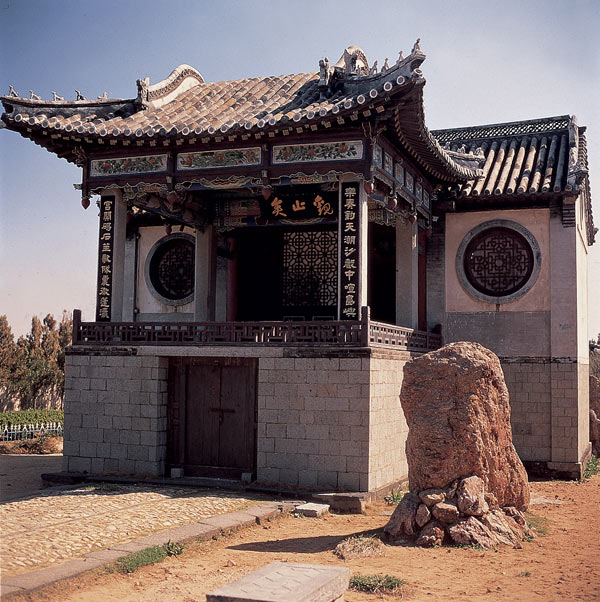 步入白云门,就是建于北宋嘉年间,已具有九百多年历史的蓬莱阁。蓬莱阁建于丹崖山上。阁下山壁,犹如斧凿刀切,齐斩斩地直抵水面。蓬莱阁并非只有一阁,而是一组古建筑群,主要由吕祖殿、三清殿、蓬莱主阁、天后宫、龙王宫、弥陀寺等六个建筑单体组成,听名字就知道是以道教为主、杂糅佛教的宗教建筑,当然少不了又有许多风格不同,但又大同小异的楼、殿、亭、阁,犹如众星拱月一般,依山就势,错错落落,层层叠叠,将那些主体建筑烘托出来。蜿蜒于各亭殿的廊壁之间,自然又少不了楹联、碑文、石表、断碣,镌刻着名人书画,其中鱼龙混杂,许多政客免不了要来此附庸一番风雅。碑刻中值得一提的应数苏东坡的手迹刻石,它横卧地上,一面刻楷书,一面刻行书,诗好,字好,人也有名,遂成阁中瑰宝。其实苏东坡在登州任上前后呆了不到五天,就被诰命回京了。他甚至没来得及看上海市蜃楼,眼看就要走了,急得这位号称“坡仙”的大诗人只好祷告海神广德王。他自己说祷告很灵验,第二天果然见了,并据此写下《海市》一诗。可以肯定苏东坡没有见到,因那时是冬季,海市的发生只在春夏。但他根据传闻和想象写出的海市,却又的确是所有描写海市的诗文中写得最好的,好就好在写出了一个“空”字。据看过海市的人说,海市出现前,一般天气较晴朗,但远处大海有一层淡淡的薄雾笼罩。海面上先是隐隐约约现出岛屿的轮廓,然后越来越清晰。岛上的道路、树木、山峰,历历可辨,有时还能看到高台楼阁,以及时隐时现的行人与车辆,持续数十分钟,然后慢慢消失、又是碧水晴天,白帆映日的眼前实景。