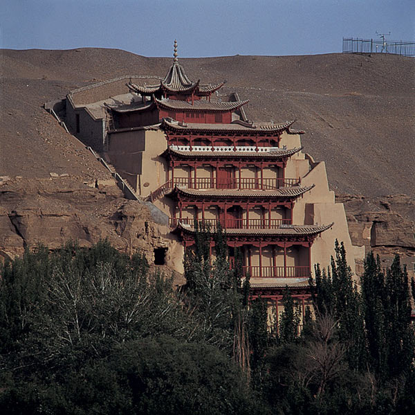 莫高窟是世界闻名的敦煌艺术宝库的正名,但当地的人们却管它叫千佛洞。离开敦煌县城20多公里处,那像蜂窝般的无数洞窟,就修建在三危山和鸣沙山交接处的峭壁上。虽然经过千百年的自然风化和人为的损坏,但是直到现在,还有492个洞窟被完好地保存了下来。这些洞窟,大者如礼堂,小者如灶洞。每个洞窟的四周和天顶以及窟内佛龛的四围,无不绘满了各式各样的壁画,就连地面上也都铺砌着各种纹样的花砖。据统计,如果把全部壁画展开接连起来,可以伸展25公里长。窟内还有2415尊彩塑菩萨,若把他们的尊驾请出洞来,沙漠中将出现一支看不到尽头的队伍,华衣飘举,环叮当,仙乐袅袅……其浩繁丰富,难以想象。