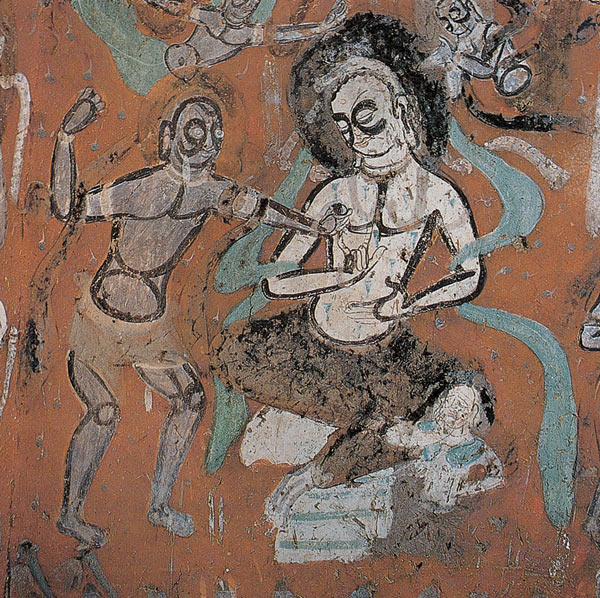 故事画又可大体分为三类。一类是宣传释迦牟尼生平事迹的佛传故事,如北周第290窟,以近80个画面描绘了释迦牟尼从诞生到出家的主要情节。人们仿佛亲眼看到释迦牟尼从兜率天上骑着六牙白象下降人寰,九龙吐水为他洗浴,一降生就走了七步,口中大声宣称:“天上天下,惟我独尊。”人们还仿佛看到他读书、习艺;看到他结婚;看到他出游,在城门外遇到老人、病人、死人与和尚;看到他夜半乘马逾城逃走;看到他剃发出家。人们还仿佛看到他修苦行,不吃东西,修了六年,把眼睛修得深如古井。人们又仿佛看到他翻然改变主意,毅然放弃了苦行,吃了农女献上的粥,又恢复了精力,走向菩提树下,同恶魔波旬搏斗,终于成了佛。成佛后到处游行、归示、度子,年届八旬,在双林涅,故事画的第二类是佛本生故事,即关于佛在他出世前五百年间各种积善行世、不断转生教化众生的故事。大致有几十种,都是表现他前世以各种不同的世俗形象施头、割肉、喂鹰、挖眼、身钉千钉、舍身饲虎的悲惨场面,歌颂他的“我不下地狱,谁下地狱”的自我牺牲精神。割肉贸鸽故事即所谓“尸毗王本生”。“尸毗王者,今佛身是也”,即释迦牟尼成佛前经历过的许多生世中的一个。这故事是说,一只小鸽为饿鹰追逐,逃匿到尸毗王怀中求救,尸毗王对鹰说,“你不要吃这小鸽。”鹰说,“我不吃鲜肉就要饿死,你为何不怜惜我呢?”尸毗王于是答应从自己身上割下相当于小鸽体重那么大的一块肉来换取小鸽的生命。他找来一杆秤,一端放鸽,一端放自己身上割下来的肉。奇怪的是,他把整个股肉、臂肉都割尽了,仍然没有小鸽重。于是尸毗王竭尽全部气力把自己整个身子投在秤盘上,以自己的全部生命来作抵偿。结果大地震动,鹰、鸽不见,原来这是神来试探他的。北魏窟中描画了这个悲壮的情景:尸毗王盘腿而坐,身躯高大,头微侧,目下视,安详镇定。他一手抬举胸前,一手手心里站着向他求救的小鸽。下面是矮小而满脸凶狠的刽子手在割腿肉,鲜血淋漓。周围配以各色人物,表情或恐惧,或哀伤,或感叹。飘逸的菩萨在旁飞舞,流畅的衣裙像强烈的音乐和声衬托这庄严的牺牲,肉体的极端痛苦消弥无形,突出于画面的,是心灵的平静和崇高。故事画的第三类是宣扬度化事迹的因缘故事,如“五百强盗成佛”。古代萨罗国曾有五百人造反为盗,国王波斯匿派大军征剿,五百强盗战败被俘,遭受酷刑,挖去双眼,流放山林。佛以神通力吹雪山药使五百强盗复明,并现身为之说法,终使五百强盗皈依佛法,剃发出家,最后成佛。