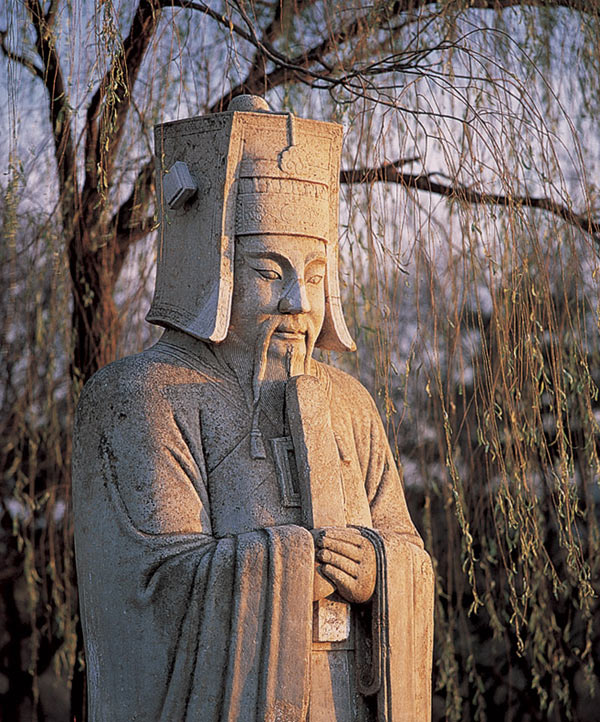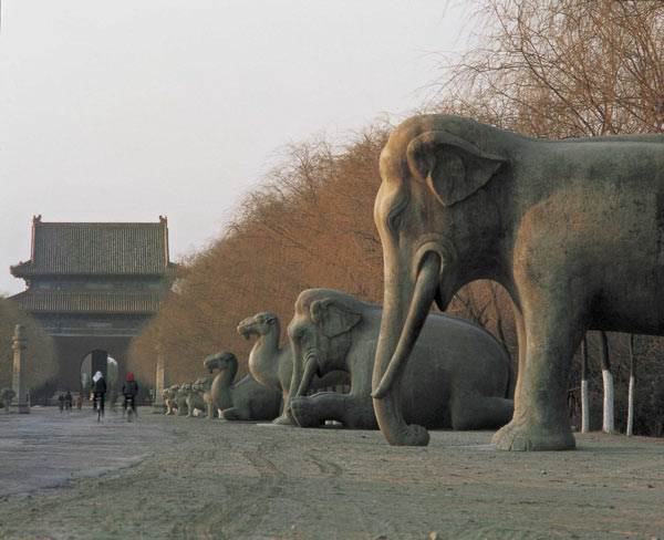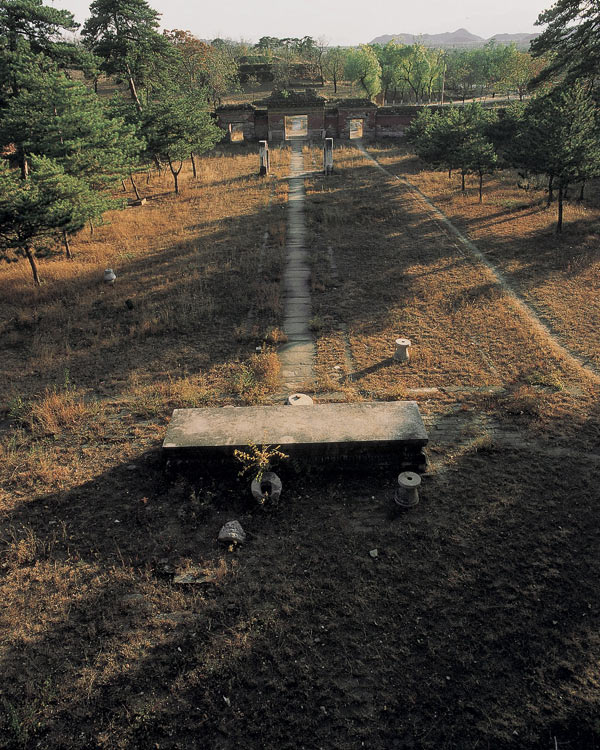 从“青龙”、“白虎”守卫的山口进去,是一块盆地,河水从盆地中央由西北流向东南。参差不齐的山峰环立于盆地西、北、东三面,如巨大的屏风。在这屏风的中央,是像龙椅一样的天寿山,正对着龙、虎二山夹峙的盆地出口,坐北朝南,俨然帝座。这种山川形势,最符合堪舆学阴宅选址的要求,最能藏纳天地之气。因为“气遇风则散,遇水则止”。而这块南向的山窝盆地,北障的群山挡住了西北之风,河水又正好流经盆地中央,形成了一个聚气的理想空间。同时,高耸的北障群山迎纳阳光,天际的远景有一个非常悦目的收束。左右丘阜环护,护卫区穴,不使风吹,环抱有情,不逼不压,不折不窜,青龙婉蜒,白虎驯,帝座庄严。在此风水宝地依山为陵,可葆帝祚永延。于是,明成祖朱棣在接到廖均卿的报告后,即着手“营山陵于昌平”。时在永乐七年(公元1409年)。成祖选中正对山口俨然帝座的那座山,只是该山的原名不好听,叫“黄土山”,他便下诏,封其“天寿山”。就在天寿山下营建他的“万年吉地”长陵。明朝共十六帝,除太祖朱元璋的孝陵在南京,惠帝朱允被逐下落不明,代宗朱祁钰的陵墓被他哥哥英宗毁掉之外,其余十三帝都在这块盆地的山边选中了自己的葬地。从长陵以后,依次是献陵、景陵、裕陵、茂陵、泰陵、康陵、永陵、昭陵、定陵、庆陵、德陵、思陵,共十三陵。它们以长陵为主体,分布在盆地北缘的山麓台地上,构成了一个规模宏伟壮丽的陵园。