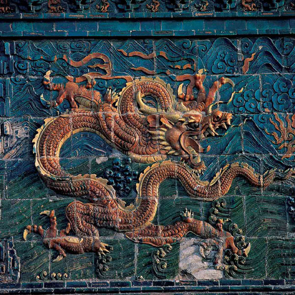 明代是山西琉璃制作业空前隆盛的时期,所遗精美作品也特别多。这个时期,在砖砌影壁上镶嵌琉璃团龙,似乎是皇宫王府的新兴装饰。这种琉璃龙壁,有独龙、双龙、三龙、五龙、九龙不等,其中大同九龙壁,是中国现存最大最古老的琉璃龙壁。