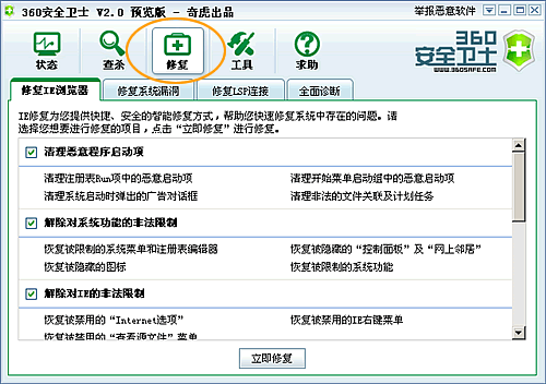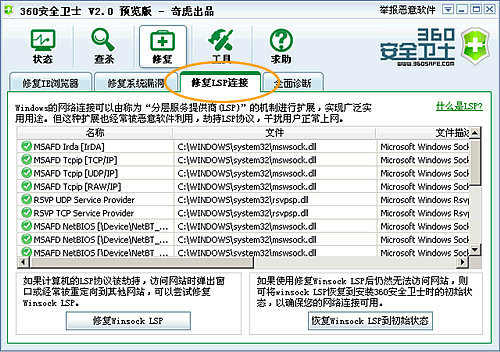 15、在“修复LSP连接”标签中可以通过修复LSP来修复您被插件木马等更改的网络设置(勾选和修复方式同前),如果前文中提及的方法无法解决弹出窗口、重定向网页等问题,您可以尝试此功能。