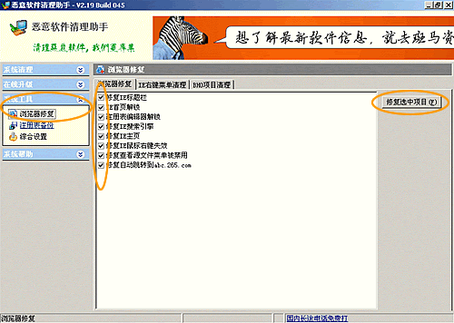 10、恶意软件清理助手还可以修复您的IE浏览器,点击左侧的“系统工具”选项卡,点击“浏览器修复字样”,勾选要修复的项目,点击右侧“修复选中项目”按钮,进行修复。