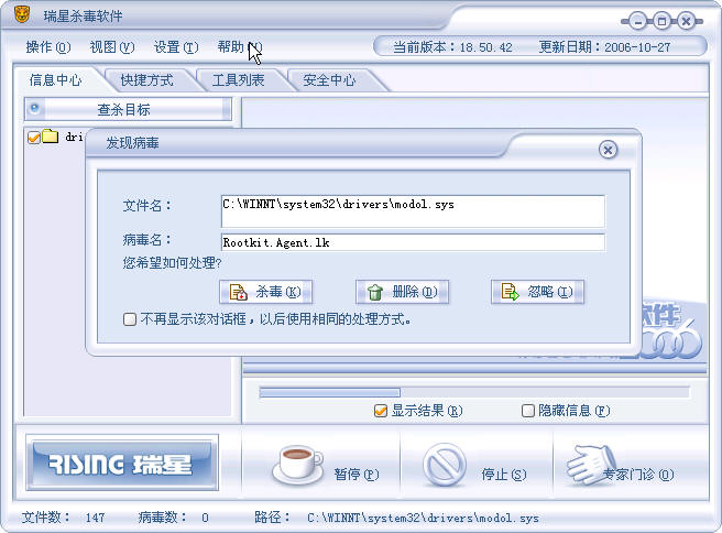 之前用灰鸽子瑞星专杀工具,查出中灰鸽子并清除了。重启以后又用瑞星2006版杀毒软件查杀了一遍。查出N多病毒并都清除成功了。但有一个病毒要重启以后才能清除,但重启以后并没有清除掉,并且连瑞星监控都打不开了。郁闷....请各位高手帮忙。现附扫描日志及不能清除的病毒图片。