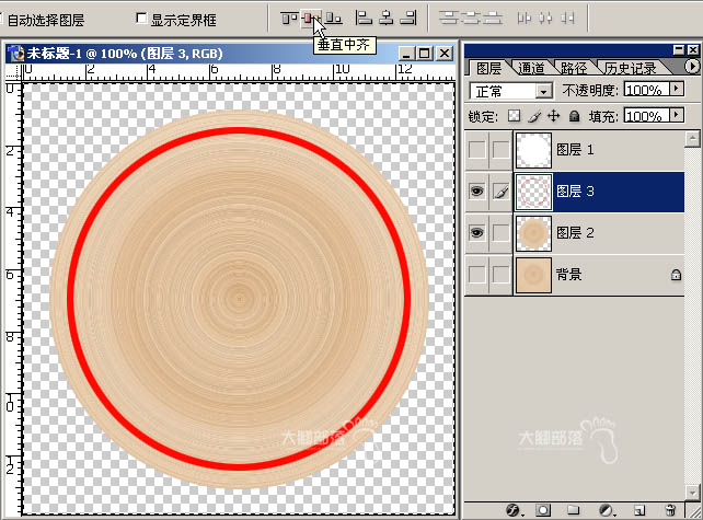 步骤二十、CTRL+A全选,切换到移动工具,点击选项栏中“垂直中齐”与“水平中齐”,使该圆形描边按页面居中