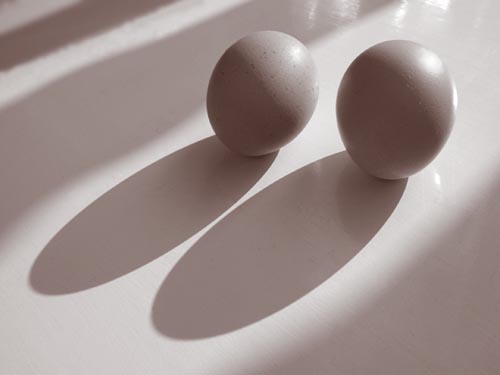 在鸡蛋下面加光源,经长时间曝光,使鸡蛋呈半透明状态;同时用光源对光盘打光,使其呈现出变换的色彩。