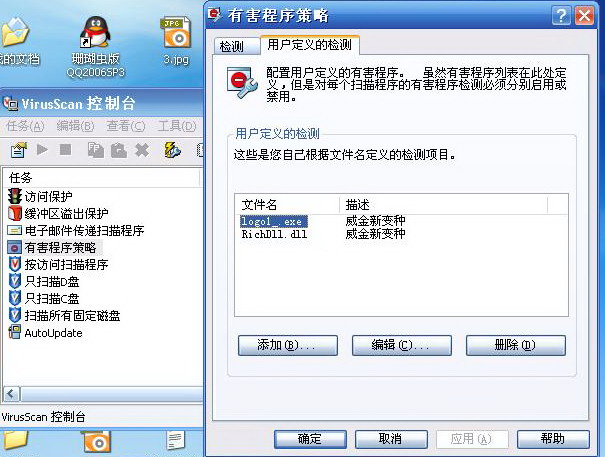 第一:要安装MACFEE杀软,然后在MACFEE的主程序里的“有害程序策略”里的“用户定义的检测”添加logo1.exe和RICHDLL.DLL,既然MACFEE能检测到RUNDL123.EXE,所以就不能添加RUNDL123.EXE这个了。