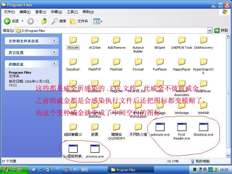 而且发现此威金病毒与之前的威金病毒有不同之处,就是之前的都会在每个文件夹下声称_desktop.ini,而这个威金病毒却不是,只是生成在系统盘跟目录下;之前的威金都把所有的.EXE都变成模糊的图标,而这个却不是,只是把图标变空白了。