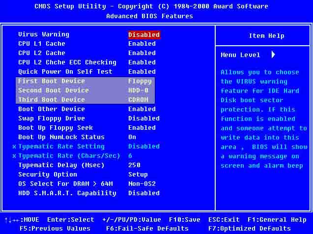 第一项"First Boot Device"顾名思义,优先级最高,黑夜是软驱,