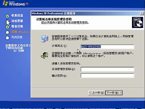 安装程序自动为你创建又长又难看的计算机名称,自己可任意更改,输入两次系统管理员密码,请记住这个密码,Administrator系统管理员在系统中具有最高权限,平时登陆系统不需要这个帐号。接着点“下一步”出现如下图