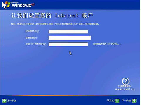 输入电信或联通提供的帐号和密码,在“你的ISP的服务名”处输入你喜欢的名称,该名称作为拨号连接快捷菜单的名称,如果留空系统会自动创建名为“我的ISP”作为该连接的名称,点击“下一步”按钮,如下图