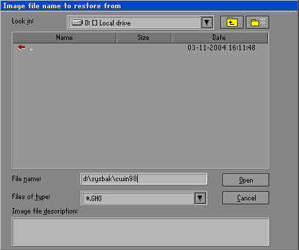 (三) 出现“镜像文件还原位置窗口”,如图12所示,在File name处输入镜像文件的完整路径及文件名(你也可以用光标方向键配合Tab键分别选择镜像文件所在路径、输入文件名,但比较麻烦),如d:\sysbak\cwin98.gho,再回车。