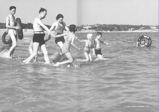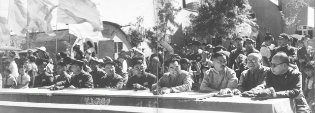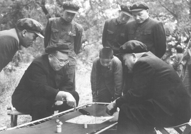 1952年,陈毅、刘伯承、贺龙、周恩来、朱德、李济深、聂荣臻、谭震林、粟裕(自右至左)在北京西郊机场观看空军飞行表演
