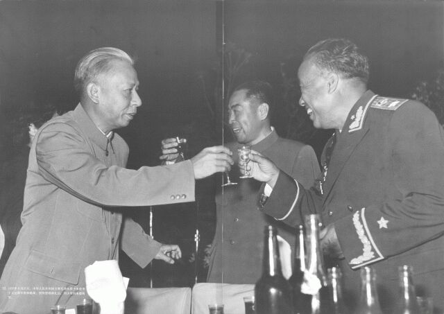 1955年9月27日,中华人民共和国主席毛**授予朱德等十人元帅军衔和勋章。授衔授勋典礼后,刘少奇向朱德祝贺。