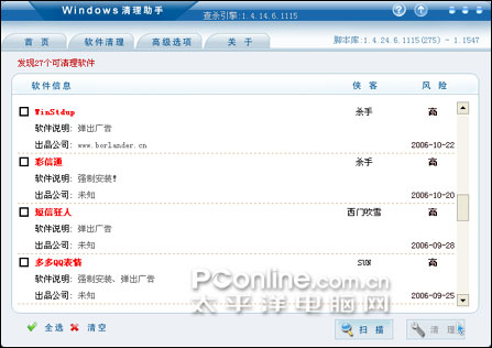 名称、表现行为、出自公司、软件类别、安装的位置、危险级别和存在状态等