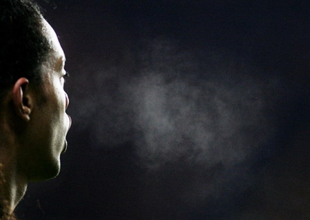 2006年2月22日,在伦敦斯坦福桥打败切尔西队后,罗纳尔迪尼奥在大口吹气。