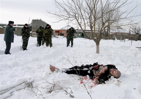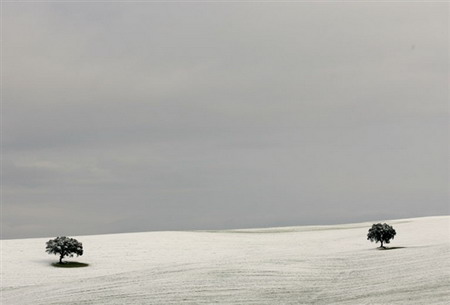 2006年1月28日,西班牙南部降雪,图为雪地中的两棵树。