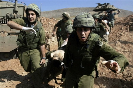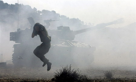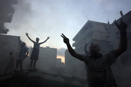 2006年6月26日,黎巴嫩提尔,黎巴嫩民众在以军空袭后的废墟上高喊口号支持真主党领袖哈桑-纳斯鲁拉。