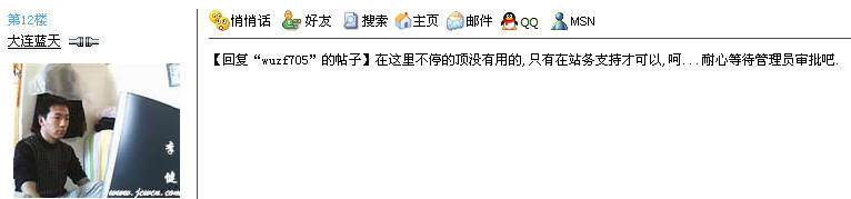 大连蓝天老版主已说过了,大伙在这儿再怎么顶是没用的,只有在站务支持才有用的。大伙就不要在这儿顶了,要支持的到站务去顶吧。