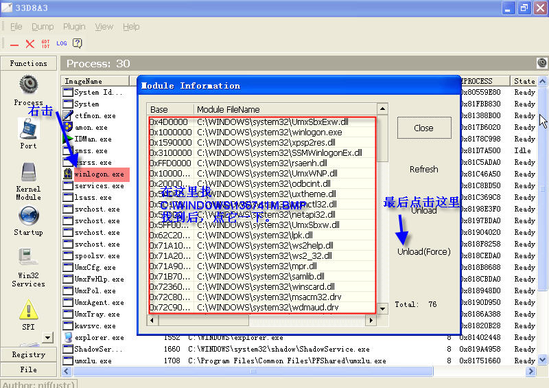 右键 选择模块信息..找到:\WINDOWS\136741M.BMP和C:\WINDOWS\system32\WSD_SOCK32.dll 强制卸除
