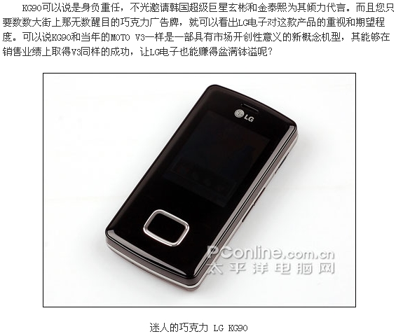 KG90可以说是身负重任,不光邀请韩国超级巨星玄彬和金泰熙为其倾力代言。而且您只要数数大街上那无数醒目的巧克力广告牌,就可以看出LG电子对这款产品的重视和期望程度。可以说KG90和当年的MOTO V3一样是一部具有市场开创性意义的新概念机型,其能够在销售业绩上取得V3同样的成功,让LG电子也能赚得盆满钵溢呢?