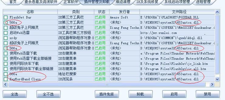 安全模式一点用都没有,我还用了兔子,只能不在工具栏显示,删不掉、不能禁用,关联文件新建IE窗口就恢复,看到很多文件名称都有个特点,就是文件名是4***ntos.DLL,只中间的*不一样。用HijackThis也没用。