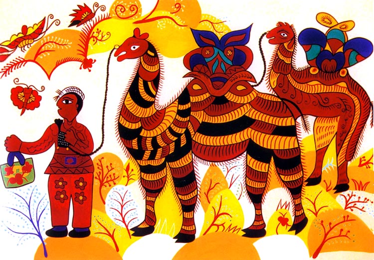 本次民间绘画展览的作者是几位在安塞土生土长的农村老大娘,她们是当地画炕围画,锅围画,墙围花,鸡蛋壳镶嵌画的高手。她们画的画造型单纯、古朴,洋溢着对生活的寄托,对生命的热爱,有着浓郁的安塞的地域特点和很强的艺术震撼力。