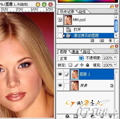 Ctrl+J复制当前图层,这样做的目的是保护源图像,即使我们不小心把MM的皮肤弄糟了,也可以很简单的恢复