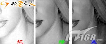 切换到通道调板。分别观察红、绿、蓝、通道的细腻程度。我们发现红色的最细腻,噪波也最少,绿色的其次,蓝色最糟糕。我们将针对不同通道的细腻程度来施以不同的模糊程度,最后达到美化皮肤的效果。