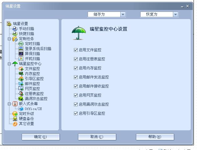 你先进入瑞星详细设置里,看一下计算机监控里的项目是否全部打开了小勾,如果是的话,点击确定后重启电脑,看看问题是否能解决。这样不行的话,你就要修复一下瑞星杀毒软件了,具体操作是:点击开始->程序->瑞星杀毒软件->添加删除组件->选择修复,修复完后重启电脑。如果这样还不行的话,你就要重新安装瑞星杀毒软件了。